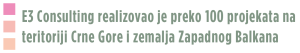 Kompanija E3 Consulting prisutna je na crnogorskom tržištu od 2008. godine. Pruža usluge biznis konsaltinga, inženjeringa, izrade projektne dokumentacije u oblasti infrastrukture, energetike, upravljanja vodama, životne sredine i društva.