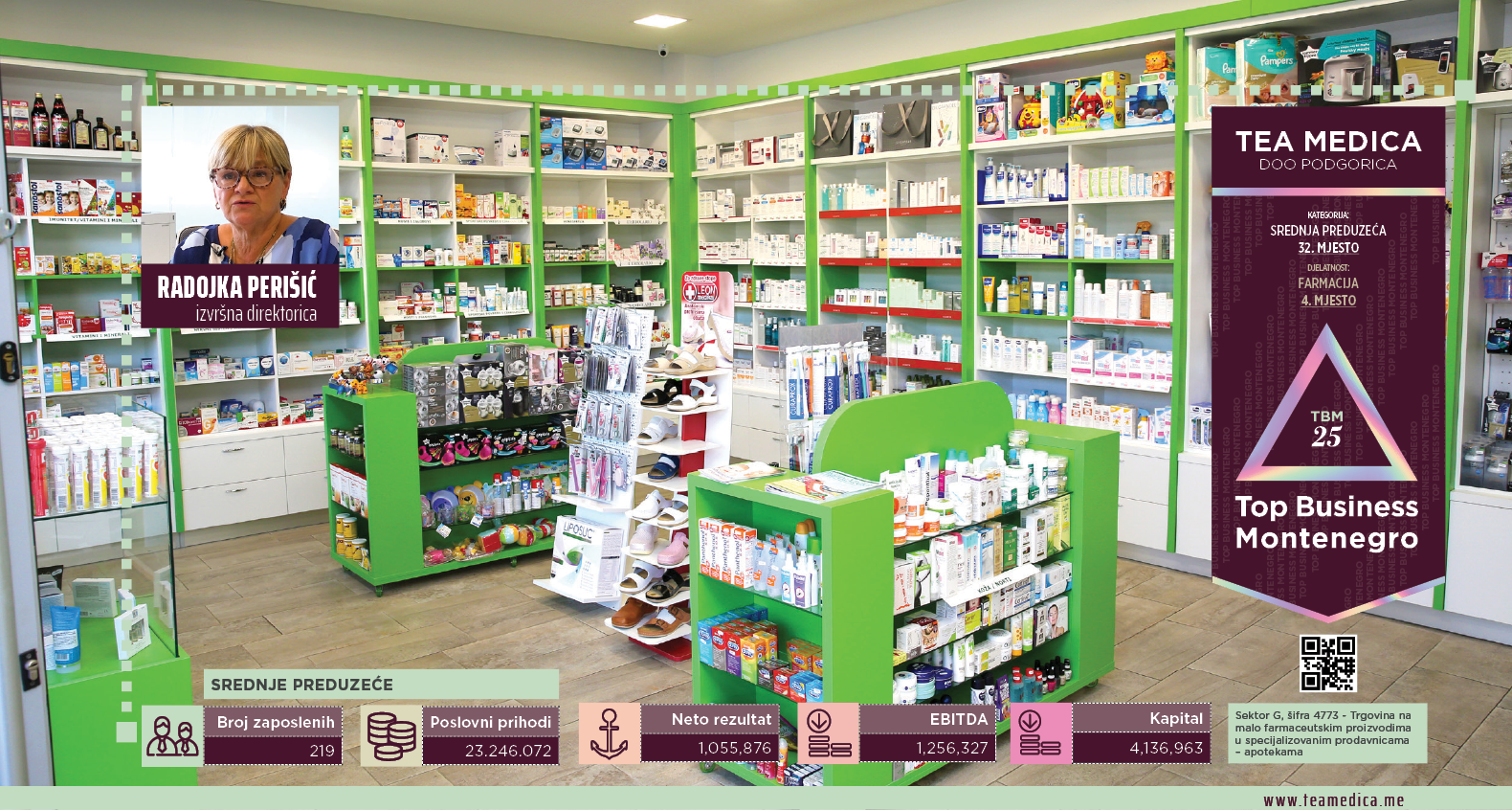 Privatna zdravstvena ustanova Tea Medica, osnovana 2004. godine, danas se sa zadovoljstvom može pohvaliti impresivnim rastom i uticajem na crnogorskom tržištu. Sa 46 apoteka u lancu, postala je sinonim za kvalitetnu farmaceutsku uslugu i brigu o pacijentima širom Crne Gore. Posvećenost pružanju vrhunskih usluga, kao i konstantan rast, cine je vodecim privatnim lancem apoteka u državi. Razvoj Tea Medica apoteka nije slučajan – rezultat je jasne misije i ciljeva koji su zacrtani na samom početku rada ustanove. Zahvaljujući pažljivom izboru lokacija, apoteke te zdravstvene ustanove nalaze se na najatraktivnijim mjestima u svim većim gradovima Crne Gore. Sa 17 apoteka u Podgorici, sa po četiri u Baru, Nikšiću, Herceg Novom, Budvi i Ulcinju, te sa po dvije u Cetinju, Beranama i Bijelom Polju, Tea Medica je sigurna pomoć i siguran oslonac pacijentima širom Crne Gore. Ključ uspjeha Tea Medica apoteka leži i u njihovom osoblju. Ponose se što su privukli i zadržali najtalentovanije – starosni prosjek njihovog tima ispod je 40 godina i u njemu dominiraju žene, što uvijek posebno ističu. Ustanova ima 209 zaposlenih, od kojih su 92 diplomirana farmaceuta, pa je jasno da je kompanija posvecena izgradnji tima visoko stručnih pojedinaca. Dodatno, Tea Medica sistem izdvaja se od drugih ne samo po najvećem broju apoteka i po visokoj stručnosti zaposlenih već i po posvećenosti konstantnoj edukaciji. Kolektiv čine magistri farmacije i farmaceutski tehničari, čije se znanje, sposobnosti i vještine neprestano unapređuju kako bi se pacijentima pružila najbolja farmaceutska zaštita, njega i prevencija. U Tea Medica apotekama kvalitetna usluga nije samo fraza – ljubazno osoblje na raspolaganju je da svaki pacijent dobije ono što mu je potrebno, uz posvećenost, brigu i razumijevanje individualnih zdravstvenih potreba. Ako se desi da određeni proizvod nije dostupan u standardnom asortimanu, apoteke će ga poručiti što je prije moguće – obično već istog dana. Interna laboratorija Tea Medica apoteka omogućava ustanovi da kreira različite magistralne preparate, prilagođene specificnim zahtjevima pacijenata. U apotekama mogu se podići lijekovi na recept zahvaljujući ugovoru sa Fondom za zdravstveno osiguranje Crne Gore, ali se može pronaći i širok spektar proizvoda renomiranih svjetskih farmaceutskih brendova. Od ljekova, preko vitaminskih suplemenata, do kozmetike i proizvoda za njegu beba i djece, asortiman u apotekama pažljivo je odabran kako bi se zadovoljile različite potrebe pacijenata. Tea Medica apoteke nude ne samo proizvode već i iskustvo. Paleta proizvoda najprestižnijih farmaceutskih proizvođača, kao što su MSD, Takeda, Roche i mnogi drugi, čini temelj ponude. Timskim radom teže da svakom pacijentu pruže vrhunsku uslugu koja će nadmašiti njihova očekivanja i osigurati njihovo povjerenje. Zato Tea Medica nije samo lanac apoteka već je i posvećen partner građanima u očuvanju zdravlja. Cilj ustanove jeste širenje mreže apoteka, kao i nastavak pružanja vrhunske usluge, koja se zasniva na povjerenju, inovativnosti i razumijevanju potreba pacijenata. Pacijenti dobijaju i proizvode i pažnju koju zaslužuju i zbog toga su Tea Medica apoteke lider u domenu farmaceutske brige u Crnoj Gori.